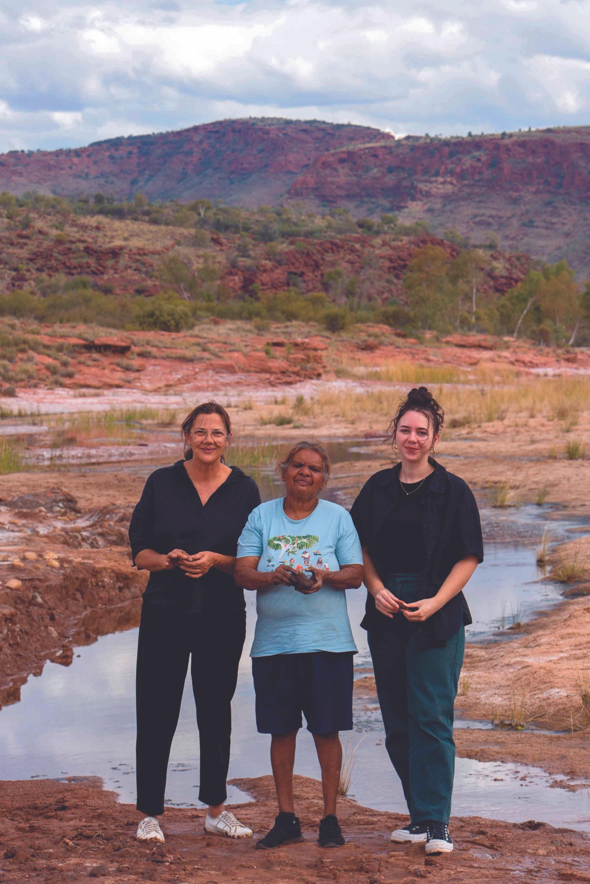 Hetti Perkins, Arrernte, Kalkadoon peoples, Hayley Coulthard, Western Arrarnta individuals, and Aspen Beattie, Warumungu, Luritja, Yawuru peoples, gathering clay from Salta-Salta Creek at Finke River, Western Aranda Nation, 2023