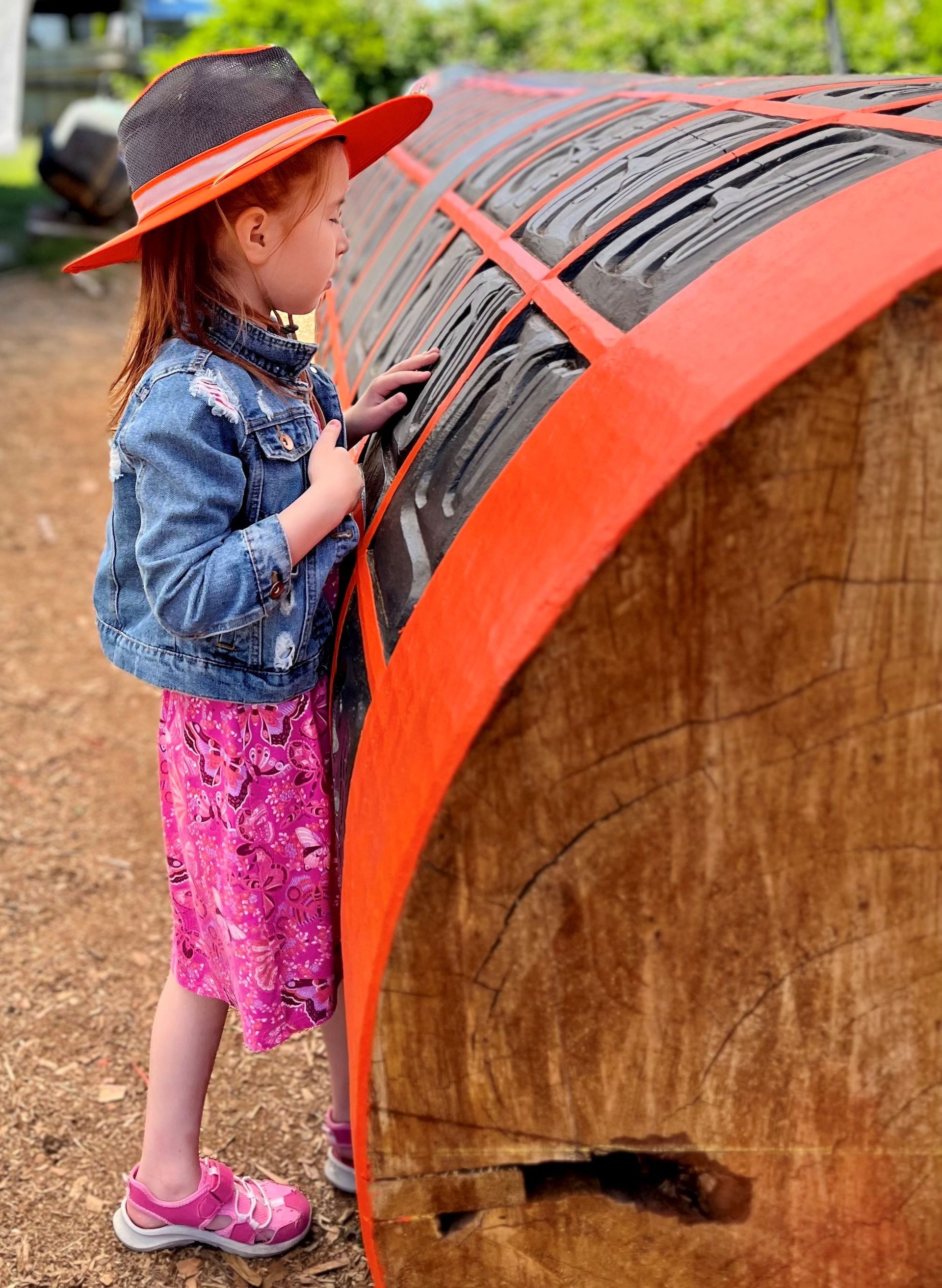 Jade, Stanley C. Hunt’s granddaughter, with the Indian Residential Faculty Memorial Monument (2023) Picture © and courtesy Nicole Hunt